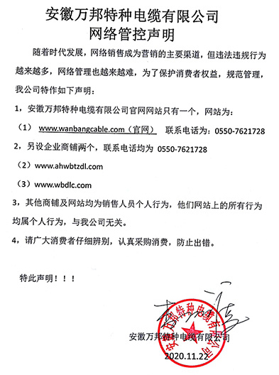 鄭重聲明:安徽萬邦特種電纜有限公司官方網站為:www_wanbangcable_com.zbcly.cn,除此之外無任何子網站或合作網站,其余均為假冒偽劣。電話:0550-7621728 13485756353 地 址:安徽省天長市滁州高新技術產業開發區經四路29號